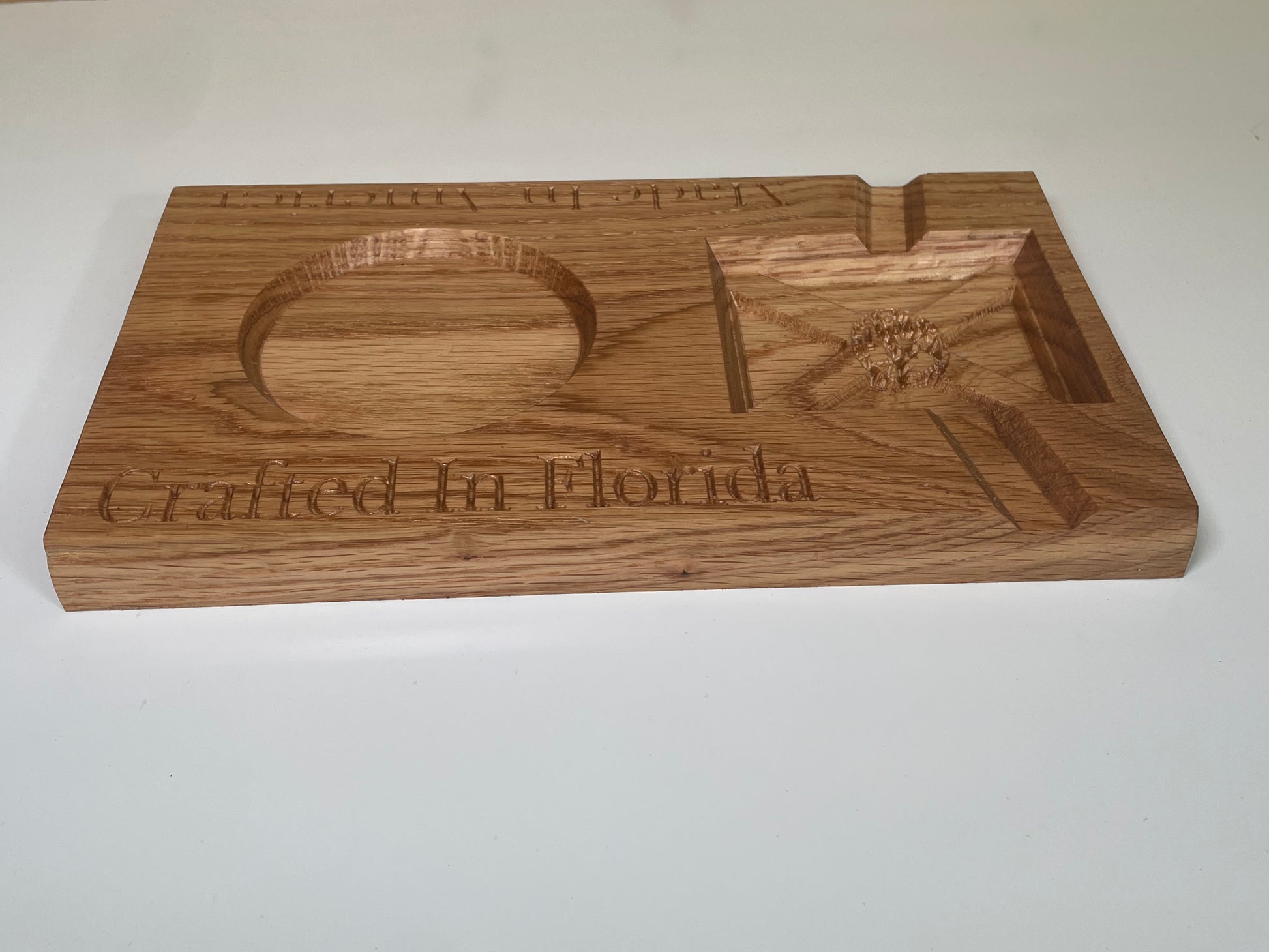 Pour a drink and light that stogie, and enjoy them with your own personal whiskey and cigar tray. This piece can be fully customized with your favorite logo or name in the wood. This piece is available in walnut and white oak.